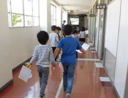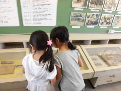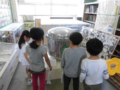 資料室を案内する2年生です。大きなタイムカプセルを見ながら、知っていることをていねいに説明してあげていました。「タイムカプセルの中には宝物が入っていて、大きくなったらこのカプセルを開けるんだって・・・楽しみだね。」1年生も感心して聞いています。2年生のリーダーシップのもと、入学して1ヶ月の1年生もしっかり行動しています。