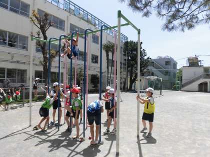 挑戦しているのは3年生です。のぼり棒、鉄棒に一生懸命に取り組んでいます。苦手なものがあっても挑戦する心と友達の応援ががんばりにつながります。