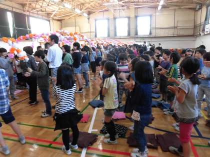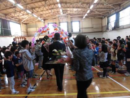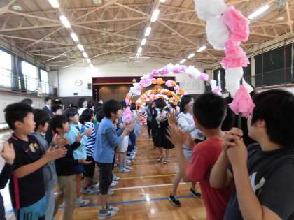 お世話になった先生や主事の皆さんと過ごす心あたたかな時間もあっという間に過ぎていってしまいました。最後のお別れのときに、6年生が花道をつくって心を伝えました。アーチをくぐる皆さんに感謝の心をもめて大きな拍手がおくられました。