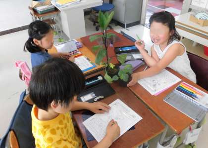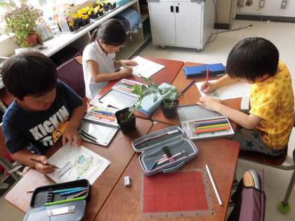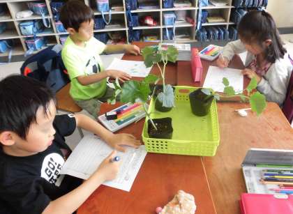 2年生が生活科の時間に野菜の苗の観察を行っていました。「なす」「オクラ」「きゅうり」をよく見て、様子を絵と言葉で表現していました。葉や茎の細かい色の変化や葉脈までも丁寧に描いる子もいました。見て感じたことを言葉で書き表すことは難しい活動ですが、一生懸命に表現を工夫している2年生。これから苗を植えて、しっかり育てていきます。野菜はどんなふうに実るのかな、どれくらい収穫できるのかな・・・楽しみです