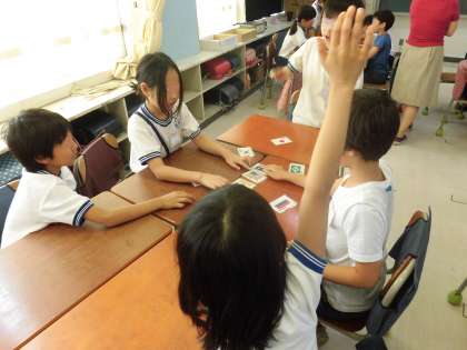 4年生、外国語活動の様子です。国の名前を英語で聞きながら、カードゲームに取り組んでいました。発音を担当したのはALTです。英語を聞き取る力が豊かに育っていることを感じる授業でした。