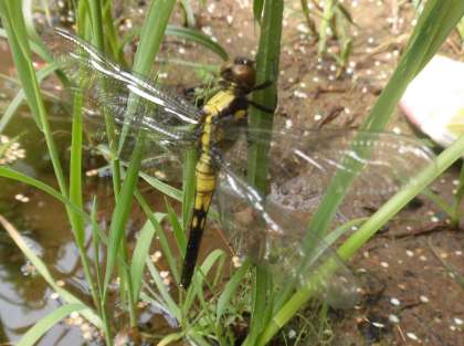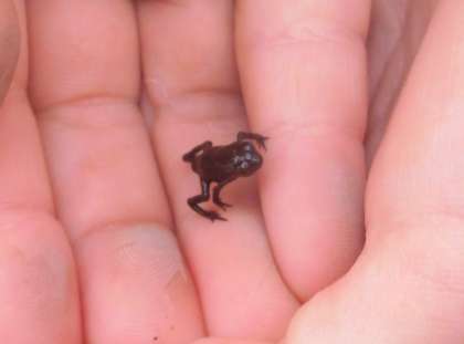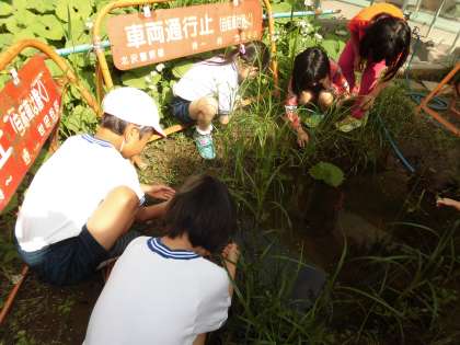 朝遊びの時間に小さな小さなビオトープに住むオタマジャクシの観察をしている子がいました。池の中央あたりを泳ぐオタマジャクシ、池のふちを見るとカエルを発見しました。みんな大騒ぎです。まだ小さくて真っ黒いカエルを興味深く観察していました。すると、草にトンボも発見。よく見るとトンボの下方に抜け殻もあります。どうやらヤゴがトンボに羽化したばかりのようです。子供たちの過ごす時間は、小さな発見でいっぱいです。この発見や物事に向かう興味関心の気持ちを大きく育ててあげたいと思いました。