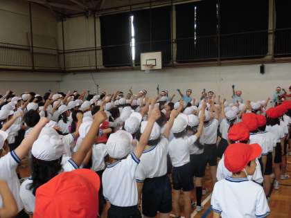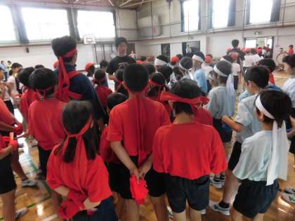 応援団に負けないくらいの大きな声で歌を歌う全校の子供たち。合間に入れる「ゴー」のかけ声に合わせて、こぶしを高らかにあげます。先生からもっと力強くというアドバイスを受け、子供たちの意気込みはますます高まりました。大きな声も出ています。応援団は、互いのがんばりを認め合います。先生からも「よく声が出ていた」と子供たちの努力を認める振り返りがありました。