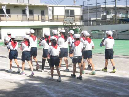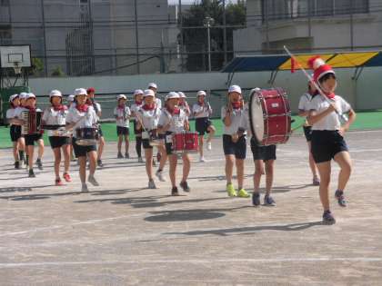 毎朝練習を重ねている鼓笛隊。今日は赤いバンダナをつけて練習に臨みました。行進も日に日に堂々としてきました。4年生もしっかりがんばっています。