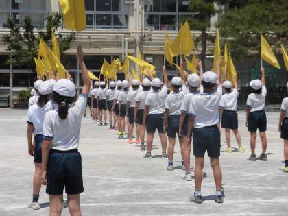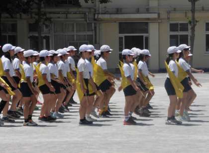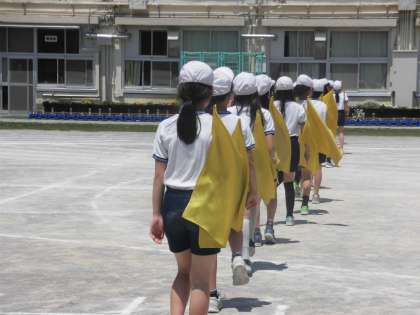 6年生の「フラッグマスゲーム」には「心」というタイトルがついています。美しさと力強さを様々な動きで表現していきます。集団で創り上げる美しさ・・・「心」を合わせることの心地よさと難しさを練習を通して感じていることでしょう。心を合わせ、隊形を整えることに一生懸命に挑戦している6年生の姿を写真で紹介します。