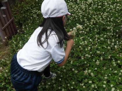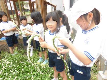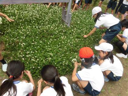 運動会の練習の合間、ビオトープのある裏庭に子供たちが集まってきました。初夏の気候のせいか、シロツメクサがぐんぐん育ち、白い可憐な花をたくさん咲かせています。今日は、ビオトープ見守り隊の皆様から教えていただいたシロツメクサの首飾りや指輪作りに熱心に取り組んでいました。自然とのふれあいは、心和むすてきな時間になりました。