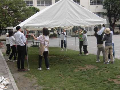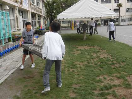 午後2時ごろ、雨がやみ始めました。5・6年生の子供たちが係として、前日準備に臨みました。どんな仕事も一生懸命に取り組む姿がありました。立派な5・6年生です。校庭は明日の運動会に備えて、スポーツの祭典会場へと変身しました。