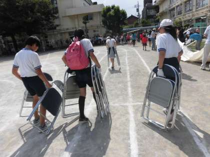 運動会が終わりました。子供たちの顔には、勝敗のうれしさと悔しさ、やり遂げた満足感など、様々な思いがあらわれています。全力で取り組んだ高学年ですから、疲れもピークのことでしょう。でも、係の片付けを終えることの大切さをしっかり受け止め、一生懸命にそれぞれの片付けを行っていました。「運動会、最後の仕事だから、パイプいすも力をいっぱい出して運びます。」と、話してくれた子供の顔には、やり遂げた充実感を感じました。