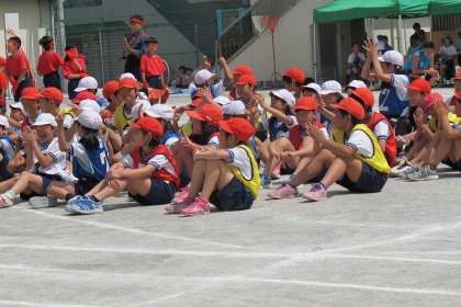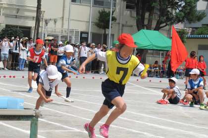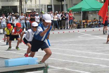 高学年の代表によるリレーです。多くの皆さんの注目する中、子供たちは緊張の様子を見せてはいるものの、堂々と入場してきました。いよいよスタートです。女子も男子もすばらしいスタートをしました。仲間たちが力強く応援します。