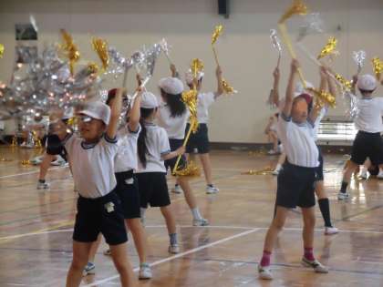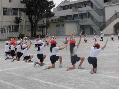 はじめのころは、丸めた新聞紙を手に持ち、練習に臨んでいた3年生。新聞紙は、練習でくたくたになってしまいました。金と銀の飾りがついたバーを初めて手にしたときの子供たちはとてもうれしそうでした。気持ちとともに、ぐんぐん上達していきました。