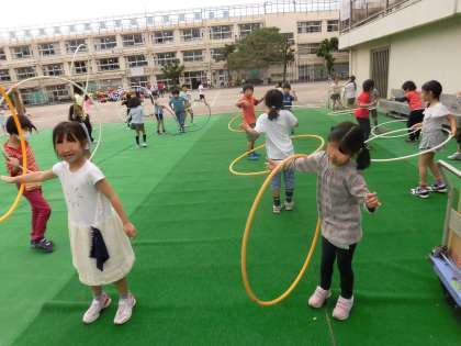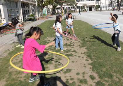 2年生は、休み時間になるとフラフープの練習をしていたことが思い起こされます。自分たちから進んで練習したいという前向きな思いからの取り組みでした。努力を楽しみに変え、継続していった2年生。練習時間には砂がついてももくもくと練習に励む姿もありました。