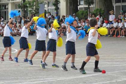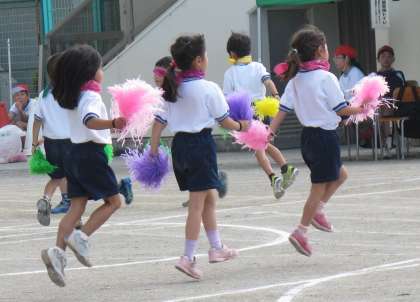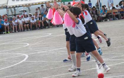 映画「ズートピア」の主題歌にのり、6色のポンポンを持って、体全体を使ってかわいらしく元気に踊った1年生。「何事にもあきらめずに挑戦する」という曲の通り、一生懸命に踊りました。かわいらし1年生に大きな拍手がおくられました。