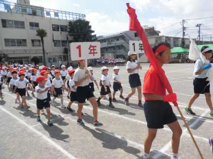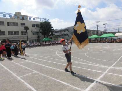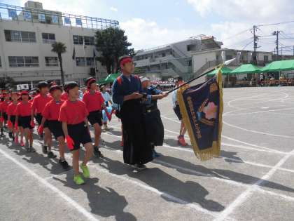 行進の様子です。最初に校旗を持った児童が入場します。この校旗、とても重たく姿勢を保つのが大変です。でも、さすが6年生。堂々としています。次に応援団、そしてプラカード係を先頭に各学年の子供たちが堂々と行進してきました。
