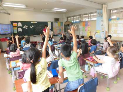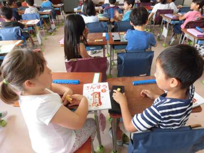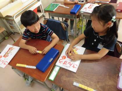 金魚をブロックに置き換えて「3+2」を確認しました。自分の考えを隣の友達に伝え合うこともしました。仲良く話し合い、思い切り手を挙げて自分の意見を伝えようとする積極的な子供たちの姿です。