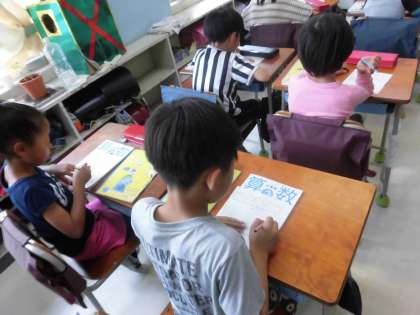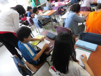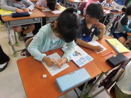 3年生の算数の授業の様子です。45分の授業を、「課題をつかむ」「既習をもとに自力解決する」「集団検討」「振り返える」という流れで進めました。どの場でも一生懸命に考えたり友達の意見を聞いたりする子供の学びの姿がありました。