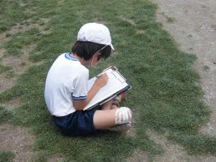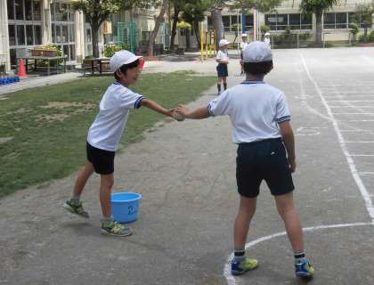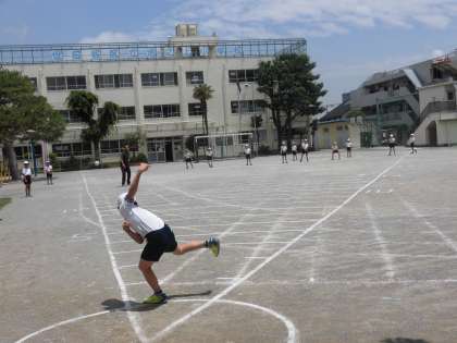 届いたボールを投げ手に渡す役も、記録も子供たちでがんばりました。ボールを受け取ると「トントン、くるっ」のリズムでソフトボール投げに挑戦です。先生のアドバイスで記録の伸びる子も多く、うれしそうな表情を見せていました。