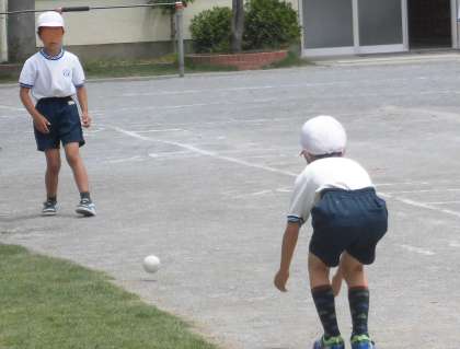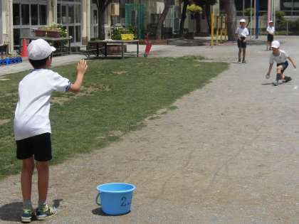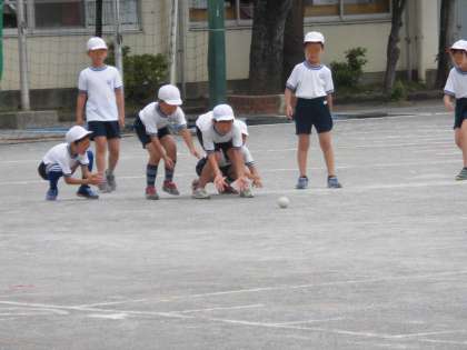 飛んできたボールを安全に気を付けながら拾い、中継係の友達にやさしく転がします。次の友達の名前を呼びながら、また、やさしく転がし、ボールが元の位置に戻ってきました。スポーツは安全を判断する力も必要です。しっかり行動できる3年生です。