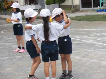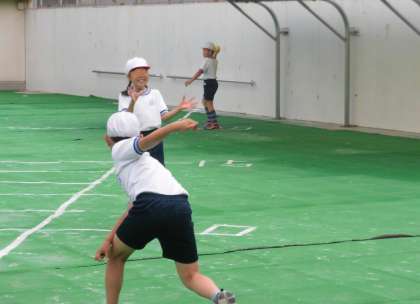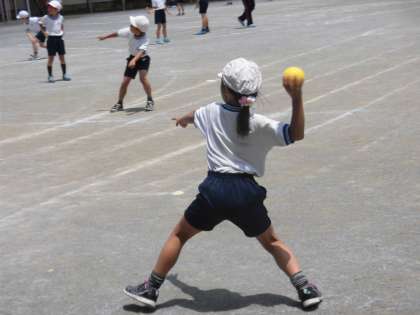 今日の3年生は、1組と2組が合同で体育を行いました。スポーツテストの種目である「ソフトボール投げ」に挑戦しました。最初に先生から投げ方のこつを教わりました。「トントン、くるっ」とリズムに乗ること、投げる角度に気を付けることなど、ポイントを確認しました。次に、3人一組で練習です。進んで「よろしくお願いします」とあいさつするグループもありました。