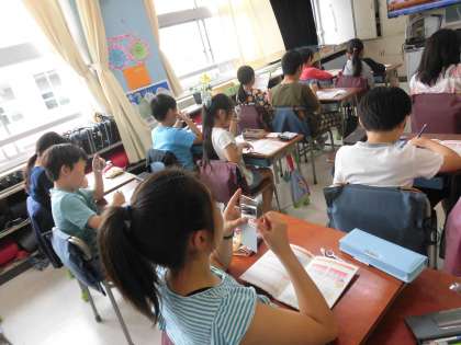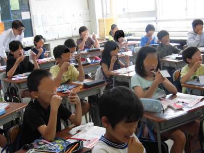授業の後半は、実際に歯ブラシを使って磨き方の練習をしました。子供たちは、自分の歯を鏡に映し、熱心に歯磨きの練習を行っていました。みんな真剣です。校医の先生にも授業に参加していただきました。歯磨きや歯の大切さのポイントを教えていただき、子供たちの意識もさらに高まったようです。これから先も自分の歯を大切し、将来にわたって健康を意識し続ける子供たちでいてほしいと願っています。