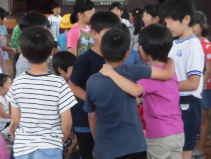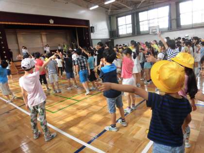 集会委員会が企画・運営する集会が行われました。「猛獣狩りに行こう」のゲームをベースに、全校の子供たちが仲良く交流できる内容にアレンジされていました。集会委員の子供たちが指示する学年の友達が仲間に入っていなければなりません。このすてきなアイディアでたくさんの学年がなかよく交流することができました。ほのぼのとした時間になりました。
