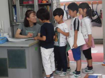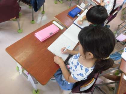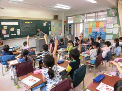 算数の時間が始まりました。先生のお話をしっかり聞いて、分かったことを発表する子供たち。手をぴんと上げる姿から勉強に向かう前向きな姿勢が伝わってきます。たし算の問題をつくってノートに書く子供たちの姿勢も立派です。問題づくりが完成すると先生に見せに行きます。先生のところに向かうときは、一方通行。学習のルールが定着していることもわかります。