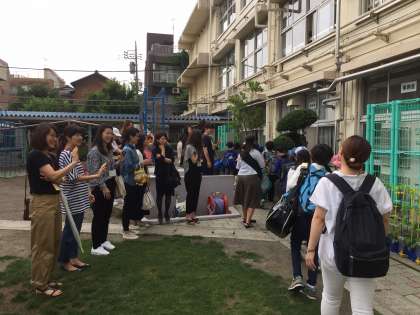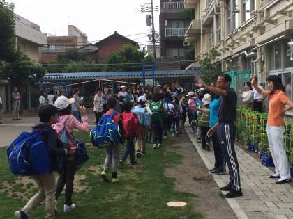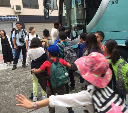 教職員も保護者の皆さまも子供たちを見送りました。子供たちは「楽しんできます」と笑顔で応えました。バスは予定通りに8時に出発しました。