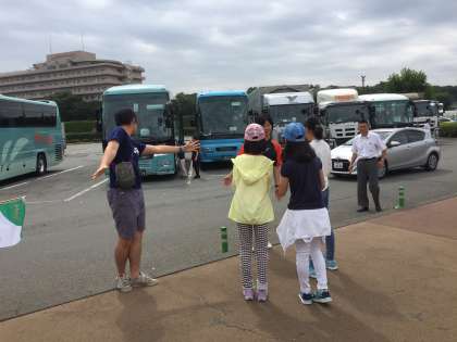 9時、三芳パーキングに着きました。写真をたくさん撮っていただいています。安全には十分に注意して行動する子供たち。補助員の皆さんが力強く誘導してくださいました。