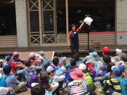 まずはお昼です。行動班で仲良くおいしいお弁当をいただきました。ゴミ捨てルールも守ります。補助員の方から「生ゴミブラック」「何でもホワイト」と分別ルールを教えていただきました。ちなみに今の気温は23度。湿度は低めでさわやかです。
