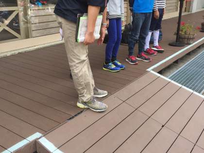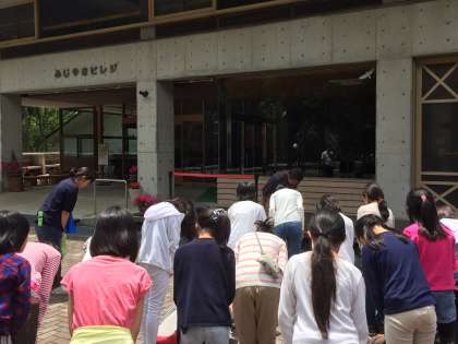 よろしくお願いしますのあいさつをしっかりしました。明日のハイキング時にふさわしい身支度についても確認しました。足元を見てください。靴下を使って虫が肌につかないよう万全の状況を整えています。