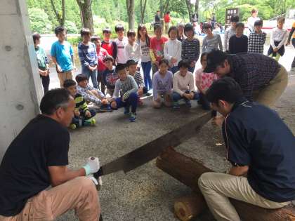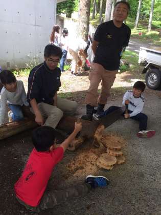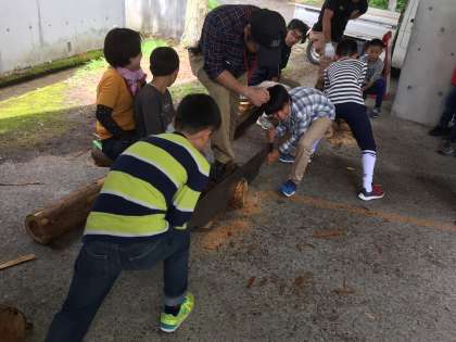 丸太切りにも挑戦しました。大きなノコギリは友達と心合わせないとうまく扱えません。でも、みんな息をピタリと合わせて次々と木を切っていきます。