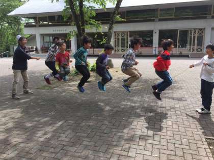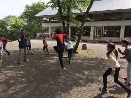 2組も長縄を楽しんでいます。縄が地面をたたく音が元気を誘います。補助員の方も一緒に挑戦してくれました。