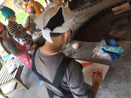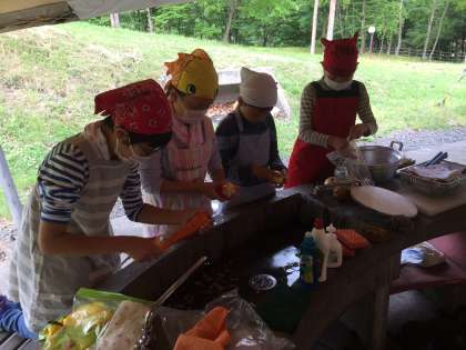 カレー担当もがんばっています。野菜を切っています。普段よりも小さく切るのがコツと聞いて、友達と話し合いながら調理しています。