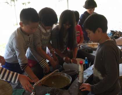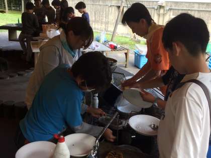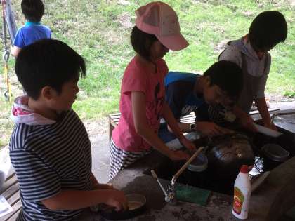 カレーをお腹いっぱいいただいた後は片付けです。ピカピカに磨かないと合格になりません。班で役割を分担して最後までがんばっています。