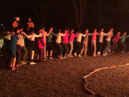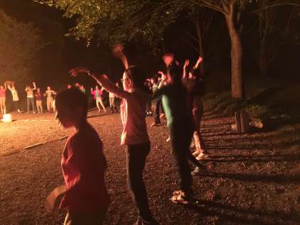 4つの火が灯されました。「幸せ」「友情」「元気」「団結」の火です。みんなも4つの火を前にして元気に踊りました。