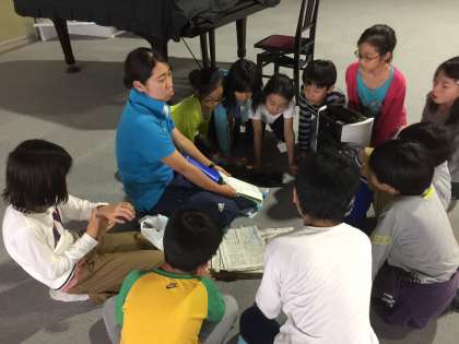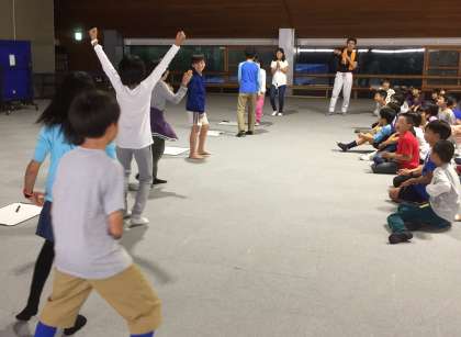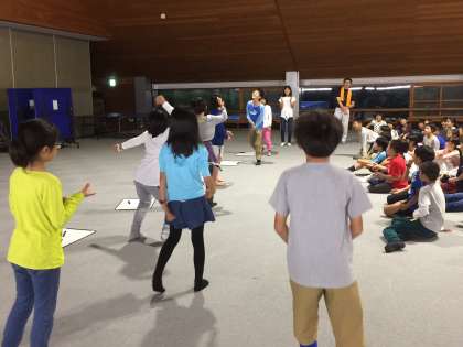 室内レクがはじまりました。レク係が打ち合わせを行っています。今日の進行を務めます。最初のゲームから盛り上がりを見せています。