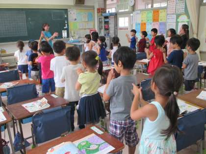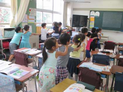 7月4日の5時間目、1年生が音楽の授業を行っていました。隣の友達と手を合わせたり、じゃんけんしたり、列車のように長く連なって音楽のリズムを表現したりと、教室全体が楽しさにあふれていました。みんないい表情です。音楽を楽しんでいます。