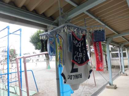 子供たちは手洗いのよさにも気づいたようです。細かいところまで洗えるなあと感想をつぶやく子もいました。洗たくした衣類が風になびいています。
