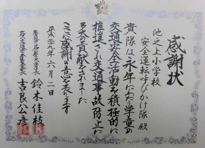 安全運転呼びかけ隊の皆様がいつも子供たちの下校を見守ってくださっています。7月の土曜授業日には、35度近い炎天下の中、子供たちの下校時の交通安全を支援してくださいました。皆様の功労に対して北沢警察署から表彰状が届きました。たくさんの皆様に参加していただいているこの活動に心から感謝申し上げます。