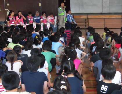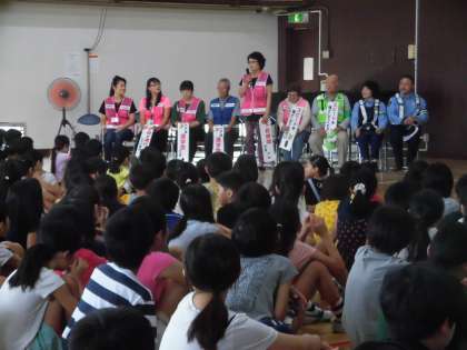 これまで池之上小学校では、子供たちとともに、安全な生活を送るために必要な行動力や判断力を身に付けるために様々な取り組みを行ってきました。避難訓練はもとより、道徳の時間や学級会の時間、朝の会や帰りの会などで、交通安全・生活安全・災害安全について学びを深めてきました。夏休みを前にして、日ごろからお世話になっている北沢警察署の皆様、安全運転呼びかけ隊の皆様に全校朝会に参加していただき、改めて子供たちに紹介するとともに子供たちにメッセージをいただきました。交通安全課の課長様から、合言葉「トマト」のお話がありました。「ト」は「止まる」の「ト」、「マ」は「待つ」の「マ」、「ト」は「飛び出さない」の「ト」とです。夏休みも安全に気を付けて、笑顔いっぱいの元気な生活を送ってほしいと願っています。