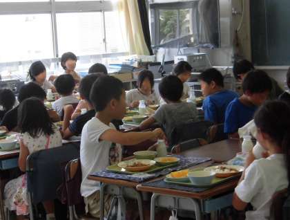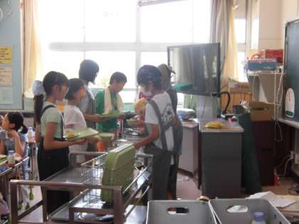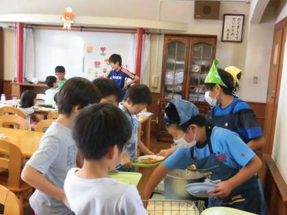 1学期最後のなかよし班活動が行われました。今日はなかよし班での給食です。高学年が給食の準備を積極的に行っていました。夏野菜のカレーを異学年でおいしくいただきました。お代わり希望の子もたくさんいました。