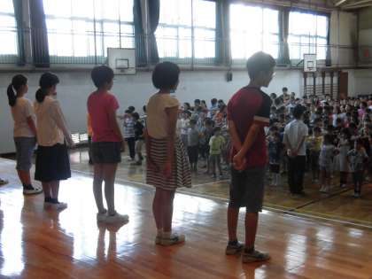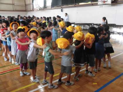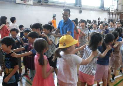 じゃんけん列車がどんどん長くなっていきます。音楽委員会の子供たちが勝ち残った友達への拍手を促しました。みんなで仲良くゲームに取り組んだ楽しい時間になりました。