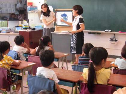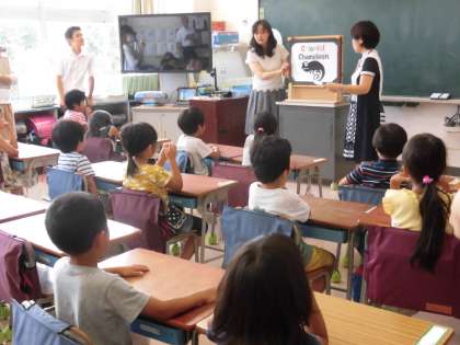 歌やカードを使って数字や色の学習をした後は、本校教員の自作の紙芝居「Colorful Chameleon」の英語の読み聞かせがはじまりました。果物やチョコレートに乗った黒いカメレオンが登場します。メロンの上に乗ったカメレオンはグリーンに変身。バナナの上に乗ったカメレオンはイエローに変身。子供たちは思わず、オレンジ、パープル、ブルー・・・とつぶやいています。英語の発音もとても上手です。物語の世界を楽しみながら、思わす話したくなる英語、使いたくなる英語・・・そんな授業を目指しています。