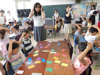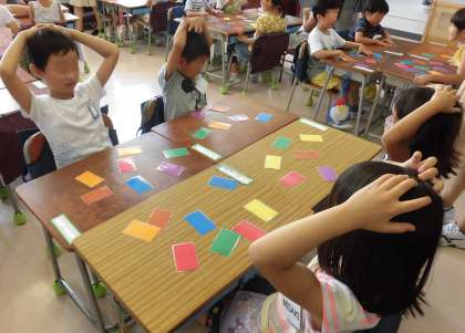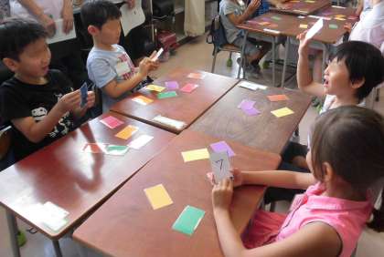 先生のお話とデモンストレーションを受けて、いよいよグループでカードゲームに挑戦です。ラッキーナンバーを聞いて一喜一憂する子供たち。英語をしっかり聞いて、理解しようとする気持ちが伝わってきます。わからなかったときは友達と相談しています。どうやらみんなカードをゲットすることができたようです。