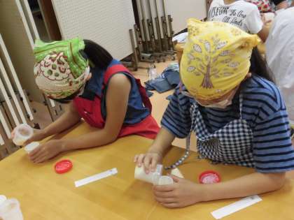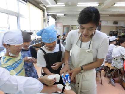 手作りバターの試食の時間になりました。作っていくうちに生まれたバターミルクも味わいました。普段家で使っているバターの味との違いを考えたり、牛乳とバターミルクとの飲み比べを行ったりしました。先生が注ぐ牛乳をもらう子供たち、毎日飲んでいる牛乳ですがとてもうれしそうです。楽しい時間になりました。