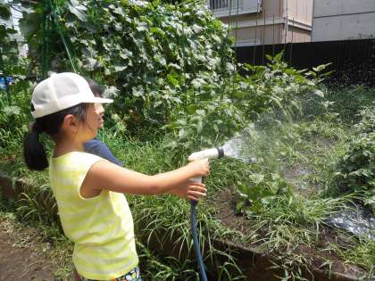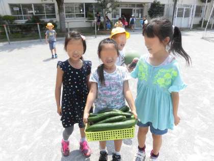 2年生が大切に育てている夏野菜がたくさん実りました。感嘆の声をあげながら楽しそうに収穫する2年生。食べごろを少し逸してしまいましたが、大きな大きなきゅうりがカゴいっぱいに収穫できました。水やりも忘れません。夏休みもたくさんの野菜が実るのかな・・・夏休みに入ってしまって観察できなくなりますが、きっと子供たちのように大きくたくましく実っていくことでしょう。