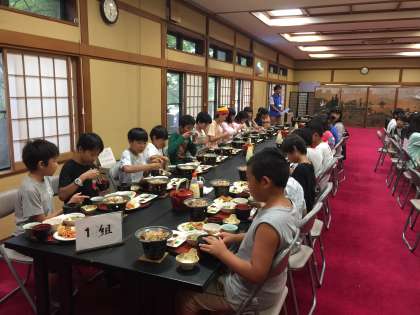 夕食の時間になりました。食事係が早めに集合してみんなのお茶の準備をしました。急須の蓋に左手を添えて、ていねいに注ぐ子が多くて感心しました。たくさん活動してお腹もぺこぺこ。みんなでおいしくいただきました。