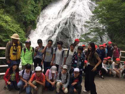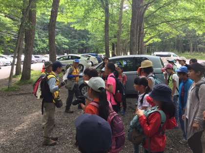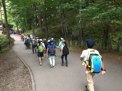湯滝から赤沼めざしてハイキングがスタートしました。自然の空気を感じて「気持ちいいなあ」とつぶやく子もたくさんいます。およそ4.5キロのこのハイキングでは、現地のガイドさんが案内してくださいます。