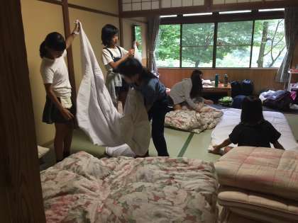 お世話になった宿舎の皆様ともお別れの時がやってきました。思い出の日光ともお別れです。感謝の心を形に表す子供たち。部屋をていねいに片付けます。友達と協力しながらがんばりました。