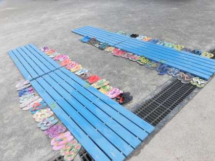 誰から指示されるのでもなくサンダルをそろえる水泳部の子供たち。1・2年生もとっても上手にサンダルをそろえていましたが、もっともっとまっすぐ並びました。