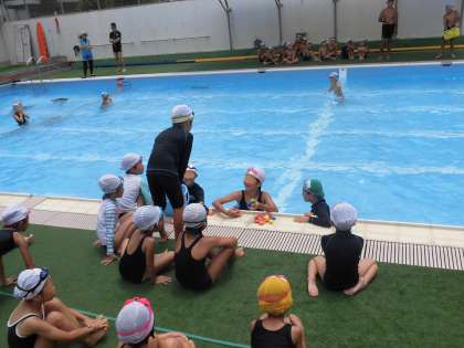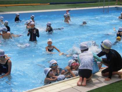 水泳指導の後半は、子供たちが楽しんで水に慣れ親しむ活動や友達と協力し合う活動を取り入れます。今日の低学年は「宝さがし」に取り組みました。5・6年生の水泳部のお兄さん・お姉さんが宝のゴムボールを水の中にまいたり、集まったゴムボールを数えたりと、お手伝いをしていました。「エイエイ、オー」と気合を入れて存分に楽しみました。
